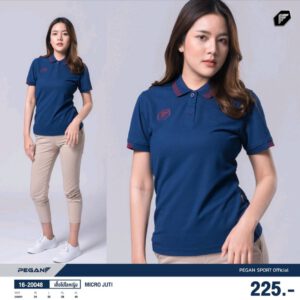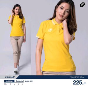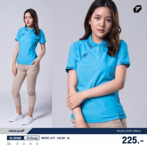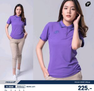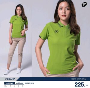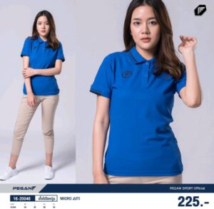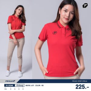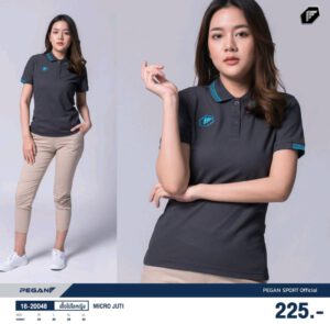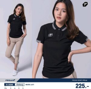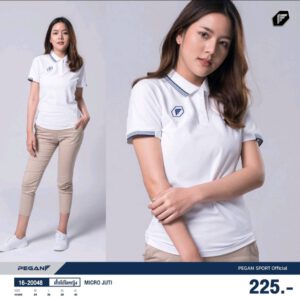 เสื้อโปโลทรงหญิง เนื้อผ้าไมโครจูติ เนื้อผ้าที่ใช้นวัตกรรมการทอแบบละเอียดด้วยโครงสร้างแบบรังผึ้ง ปกทอเส้นใยโพลี เรียบ ไม่ย้วย ไม่เป็นขุย ตกแต่งซกทอที่ปลายแขนแมตช์กับตัวปก
